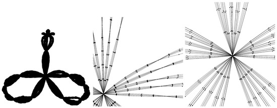 Two examples of centered polygonal lacunary functions, plotted for , where (see Equation (3)). The left panel shows the case for while the right shows the case of . The superimposed line segments represent the symmetry angles ( through ). The terminus of the line segments at the natural boundary sits at a point where does not converge, but the limit value is a bounded -cycle.