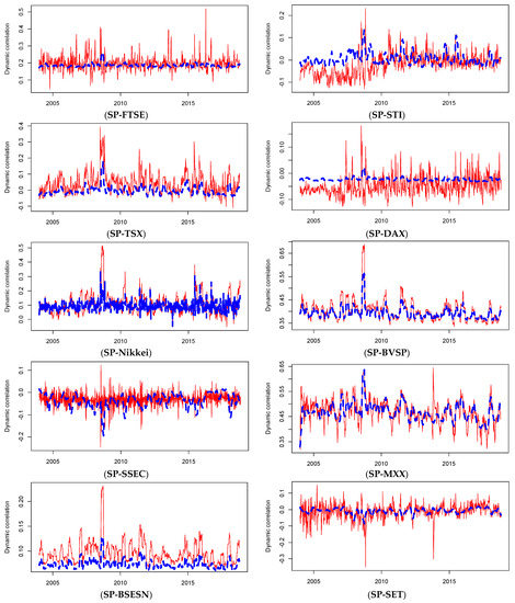 Prior to interpreting the results, we had to find the optimal copula functions explaining the co-movement between different stock market pairs during the considered sub-periods separately. To find the best fit copula functions, we considered the Akaike information criterion (AIC) [40], and the lowest value indicated the best copula function. The best copula specification is indicated in bold. First, we focused on the pre-crisis period, the static Gaussian copula is the best choice for SP-SSEC, SP-FTSE, SP-MXX, and SP-SET pairs, Student’s t copula for SP-BVSP pair, Clayton copula for the SP-Nikkei pair and Frank copula for SP-STI, SP-TSX, SP-BSESN, and SP-DAX pairs. However, in the crisis period, we observe that SP-STI, SP-MXX, and SP-SET pairs are well modeled by Gaussian copula. The best-fitting copula for SP-TSX and SP-DAX pairs is the Student’s t copula, while the best-fitting copula for SP-SSEC, SP-BSESN, and SP-Nikkei pairs is the Clayton copula. For SP-BVSP and SP-FTSE pairs, we find that Gumbel and Frank copulas are, respectively, the optimal functions. Lastly, in the post-crisis period, AIC shows that the static Gaussian copula performs better than the other static copulas for SP-STI, SP-TSX, and SP-DAX pairs, Student’s t copula for SP-FTSE, SP-MXX and SP-SET pairs, Clayton copula for SP-SSEC and SP-Nikkei pairs, and Gumbel copula for SP-BVSP and SP-BSESN pairs.