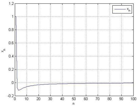 Choose , , and . The numerical for the sequence are shown in Table 2 and Figure 2. Therefore, does not converge to 0. □