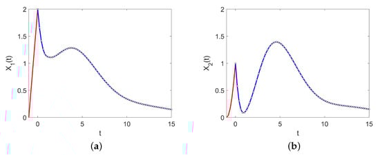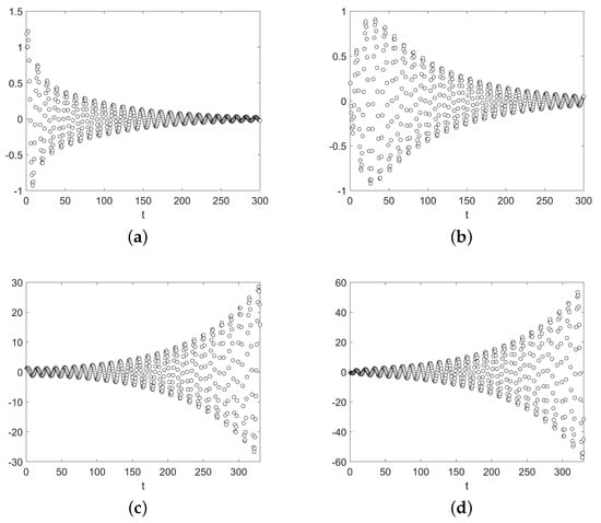 Matrix B has real eigenvalues, and . Hence, in this case the trivial solution of (7) is asymptotically stable if all the eigenvalues β of B satisfy [] (p. 289), i.e., for . As shown in Figure 4, the numerical solutions present the correct behaviour, even for values of τ close to the limit of stability. For both components, the solution approach zero as t increases for , inside the region of stability (Figure 4, top), while they diverge for , outside the region of stability (Figure 4, bottom).