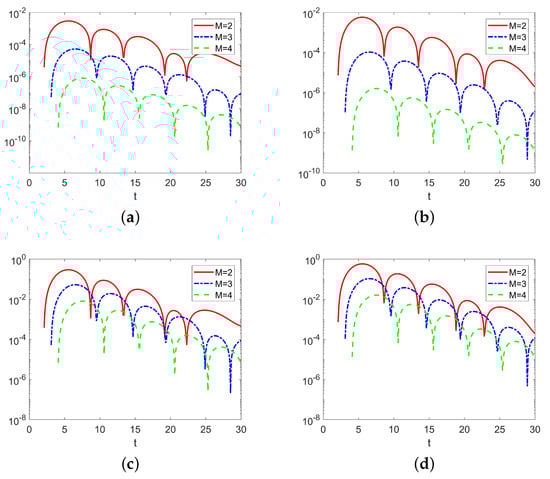 Absolute errors (log-scale) of numerical solutions for Example 1, computed using three different schemes of increasing orders, with . (a,b) Absolute errors for the first and second component, respectively. (c,d) Errors divided by .