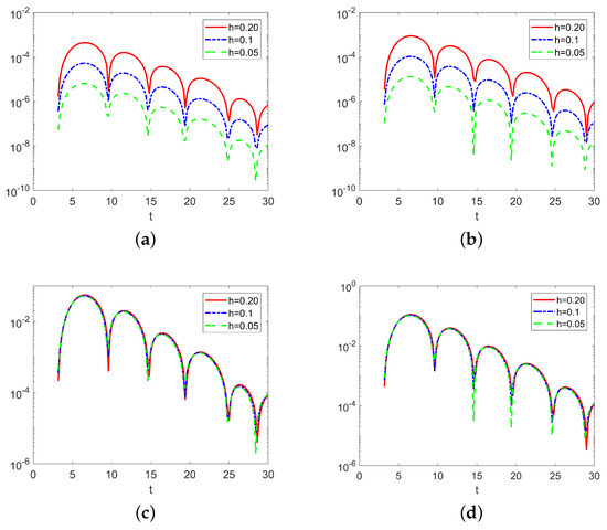 Errors (log-scale) of numerical solutions for Example 1, computed with the method using three different mesh sizes. (a,b) Absolute errors for the first and second component, respectively. (c,d) Errors divided by .