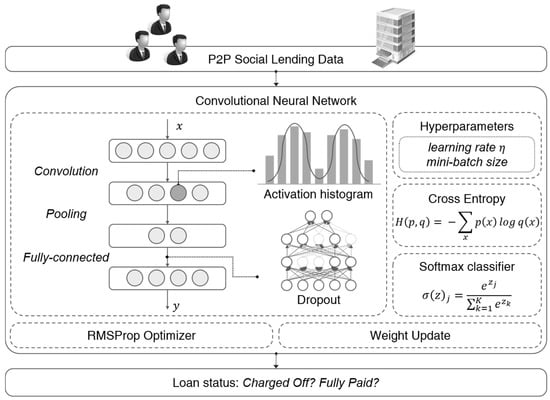 Forward propagation is performed using Equations (3)–(6), and gives us the error of network. The deep CNN weights are updated using a backpropagation algorithm based on the RMSProp optimizer [32] that minimizes the categorical cross entropy in the mini-batches of the lending data. RMSprop is a method to maintain the relative difference between variables of recent change using exponential averaging. We set the learning rate as 0.001 and the number of samples per batch as 512.
