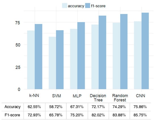 We obtained an accuracy of 75.86% and achieved higher performance than the conventional machine learning methods. Figure 3 shows the comparison of the proposed method with other methods.