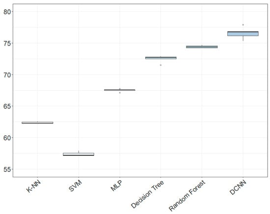 5-fold cross-validation is performed to verify the usefulness of the proposed method. Deep CNN showed the highest performance compared to other machine learning methods, followed by random forest, decision tree and multi-layer perceptron. Figure 4 shows a comparison of accuracy on 5-fold cross-validation.