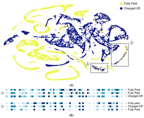 We use the saved model above from 10,000 samples to extract the features and project the samples in two-dimensional space at the layer before classification by performing forward propagation. Figure 6a shows the t-SNE results projected in two dimensions. The distribution of the repaid borrowers and the non-repaid borrowers is well-clustered. On the other hand, there are clusters that are often mixed like the marked parts. Three samples are selected at random from each cluster as shown in Figure 6b. It can be seen that those samples have similar patterns in features even though they belong to different classes. However, it has turned out that the trained model with the extracted features works out for repayment prediction very well.