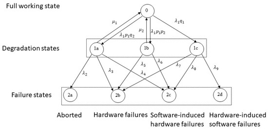 The working states include full working state (0) and degradation states (1a), (1b), and (1c). Hence, the reliability of hardware-software interactions is obtained as follows: