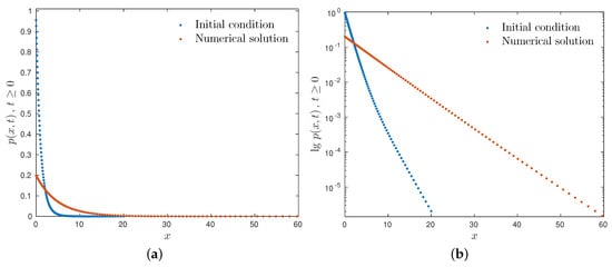It might happen that both effects balance each other and result in a steady solution. Such a simulation is presented in this Section. The numerical and physical parameters are given in Table 2 (the right column). The initial condition along with the probability distribution at the end of our simulations are shown simultaneously in Figure 3a,b in Cartesian and semilogarithmic coordinates, respectively. The trajectories of grid nodes are shown in Figure 2c. One can see the rapid initial expansion stage, which is followed by a stabilization process, when we almost achieved the expected steady state. Again, the grid nodes trajectories show excellent adaptive features of the numerical scheme—at the end of the simulation, the relative density of nodes turns out to be preserved. The semilogarithmic plot shown in Figure 3b shows that the numerical solution is free of numerical instabilities. The obtained steady solution will be preserved by discrete dynamics thanks to the well-balanced property demonstrated in Section 4.1.