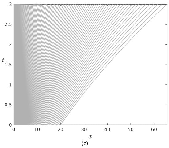 In simulations presented below, we chose . Then, we chose the initial sampling , with and . It is desirable that the initial sampling be adapted to the initial condition, since errors made initially cannot be corrected later. One of the possible strategies for the initial grid generation can be found in ([], Section 2.3.1). We define also . We stress that stand for a discrete cumulative mass variable and, thus, they are time independent.