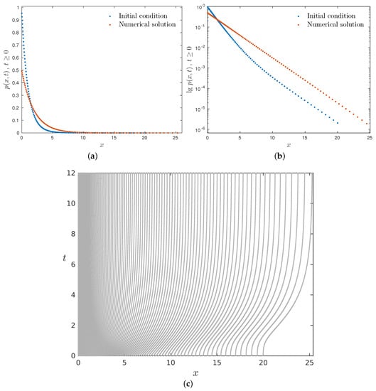 If the drift coefficient , this term will cause Feller’s Equation (1) to transport information in the rightward direction. This situation is quite uncomfortable from the numerical point of view since the initial condition expands quickly towards the (positive) infinity. We submitted our method to this case. All numerical and physical parameters are provided in Table 2 (the middle column). The initial condition along with the probability distribution at the end of our simulation are shown simultaneously in Figure 2a,b in Cartesian and semilogarithmic coordinates correspondingly. As expected, the support of the initial condition more than triples from to . We remind that the diffusion and drift coefficients are proportional to x, and the scheme handles the growth of these terms automatically. The smooth decay of the solution on the semilogarithmic plot (see Figure 2b) shows the absence of any numerical instabilities. The trajectory of grid nodes is shown in Figure 2c. One can see that points follow the expansion of the solution. Nevertheless, they concentrate in the areas where the probability takes significant values.