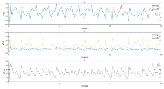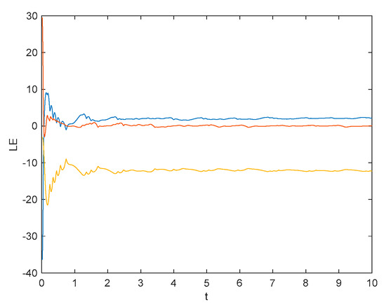 - Determine the step size and the interval of solution. Taking the fractional-order unified chaotic system as an example, the step size h = 0.01 is selected. The number of points is selected as N = 10,000, and the upper limit of integration is T = 100 (h = T/N).