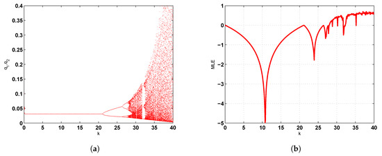 (a) bifurcation diagram of and when varying k; (b) Lyapunov exponent with respect to k.