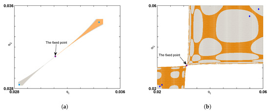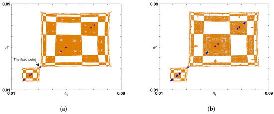 (a) Basin of Attraction of period 8-cycle at ; (b) Basin of Attraction of period 16-cycle at .