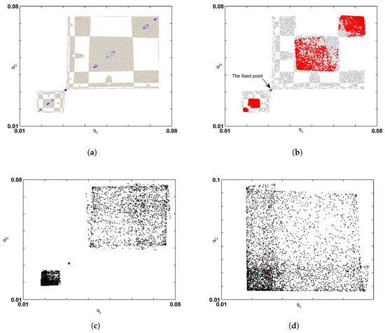 (a) Basin of Attraction of 8-band chaotic attractors at ; (b) Basin of Attraction of 4-band chaotic attractors at ; (c) phase portrait of 2-band chaotic attractors at ; (d) phase portrait of 1-band chaotic attractor at .