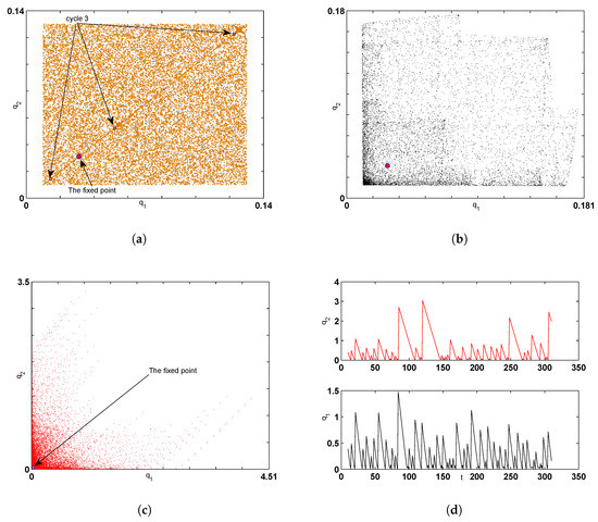 Simulation shows that there are no stable cycles with period 6 and the system jumps instead to a stable period 8-cycle when varying the value of the parameter k to 27.74 with the other parameter values are fixed. This cycle is presented in Figure 3a with its basin. Increasing k slightly to gives birth to a stable period 16-cycle as shown in Figure 3b. After that, no other period cycles are obtained and the system starts to behave chaotically. To understand that, we increase the parameter and keep the other parameter values fixed. We get a chaotic behavior of the system around the fixed point as shown in Figure 4a. This chaotic behavior consists of an 8-band of chaotic attractors. This situation is called corridor stability which refers to small perturbations in nonlinear dynamic systems may be recovered as long as they are confined within a basin of attraction of the stable fixed point. Increasing k a little gives birth to a 4-band of chaotic attractors as shown in Figure 4b. This 4-band is reduced to only 2-band when k reaches . The phase portrait of this 2-band is given in Figure 4c. This 2-band of chaotic attractors is reduced to only one chaotic attractor as as given in Figure 4d. It continues to appear until and then the systems turn to a stable period 3-cycle at . The basin of attraction of these period cycles is given in Figure 5a. Then, the behavior of the system (5) will continue changing between a stable 3-cycle, and a one piece of chaotic attractor until k approaches 33; then, the behavior becomes entirely chaotic with only one piece of chaotic attractor. We give examples of those chaotic attractors in Figure 5b,c. Figure 5d gives the time series of the chaotic attractor given in Figure 5c.
