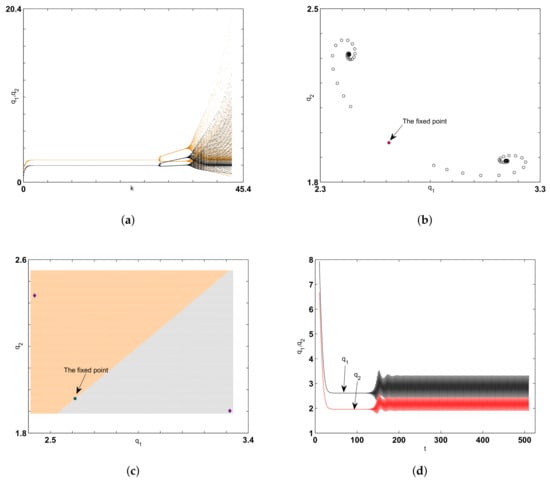 The readers should be aware that the above obtained results are for very small values of equal costs and for small parameter values of and . Now, we focus on the situation when the summation of and is almost close to 1. Let us set the parameter values to , and . Figure 6a shows that the fixed point becomes locally stable with respect to k, but, when k reaches , it becomes unstable due to Neimark–Sacker bifurcation. Increasing this parameter to 29 gives birth to two stable spirals around the fixed point. After that, these two stable spirals turn to a stable period 2-cycle when we increase k to , and the other parameter values are fixed. Figure 6c presents this cycle with its basin of attraction around the fixed point. In Figure 6d, we plot the time series for this stable period 2-cycle. One can observe from the numerical simulation that the system starts to form closed sets as k increases until it reaches , where we get a one piece chaotic attractor. Figure 7 gives some behaviors of the system at different values of k.