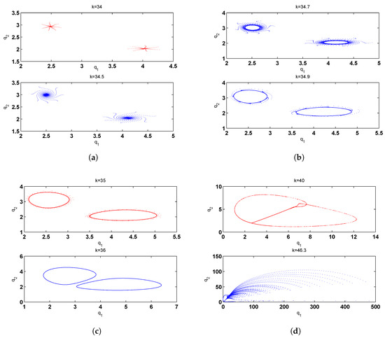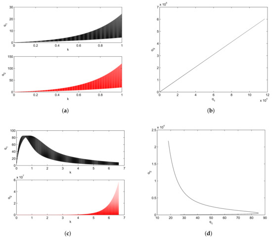 (a) bifurcation diagram when varying the parameter k; (b) the phase portrait at , ; (c) bifurcation diagram when varying the parameter k; (d) the phase portrait at .