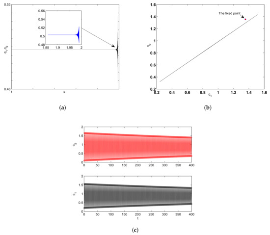 which is positive under the condition where . Therefore, both eigenvalues are real. Thus, if the second or the third condition of (11) is not satisfied, then the fixed point loses its stability via flip bifurcation. □