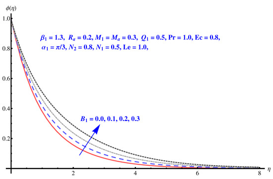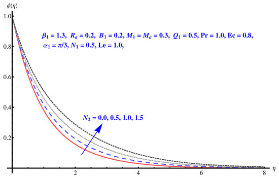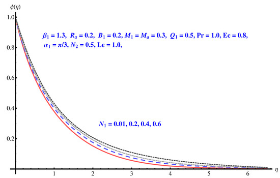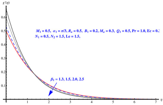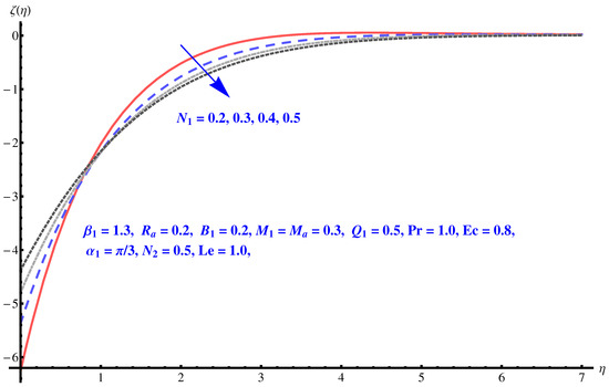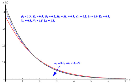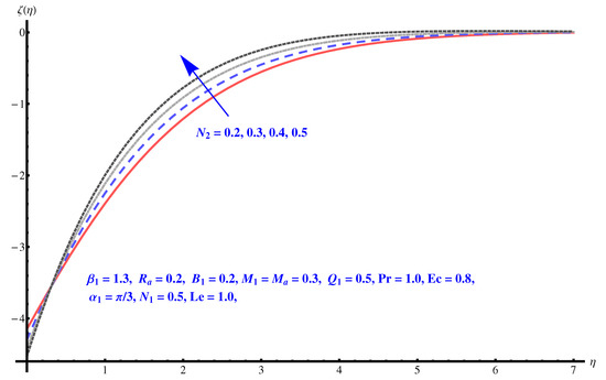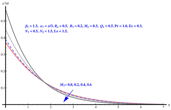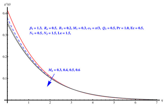 We now solve the governing Equations (8)–(13), numerically by employing Runge–Kutta fourth-order technique. For different sundry parameters, we perform numerical computation.