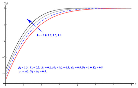 The significance of Brownian motion on concentration profile is displayed in Figure 9. It is observed from the sketch that larger values of fluid concentration reduce far away from the surface and vanish after . On the other side, it increases near the surface. This is due to the existence of slip mechanisms of fluid particles, which influence the hydrodynamic and thermal bounce. Hence, the presence of this terminology does not have significant impact on flow concentration. Further, both thermophoresis parameter and Lewis number show increasing impact for concentration profiles (see Figure 10 and Figure 11). The improvement in fluid concentration profile via Lewis number is due to the fact that it is characterized by fluid flows where simultaneously mass and heat transport are involved. Therefore, an improvement is found in fluid concentration.