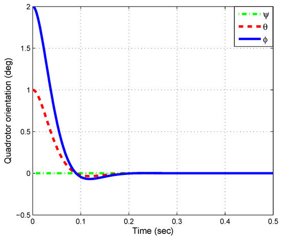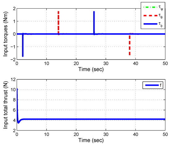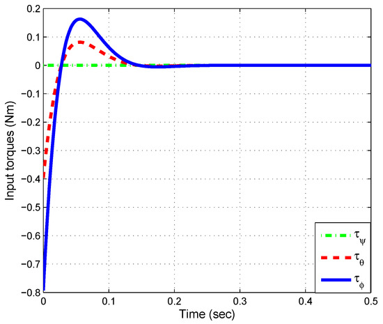 The results of the state feedback controller with the gain matrix (25) are shown in Figure 2 and Figure 3. Figure 2 displays the quadrotor attitude (roll, pitch, and yaw) with . Note that the stabilization time is about s, thus the state feedback controller with the gain matrix K calculated by LMI provides good transient performance. Figure 3 shows the input torques. Here we can observe that they are smooth.