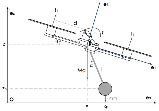 In order to show the energy-based control law design in a simple manner, let us consider the system as a planar system operating in the axis, as illustrated in Figure 4. The controller synthesis for the three-dimensional case is presented in Section 4.2.