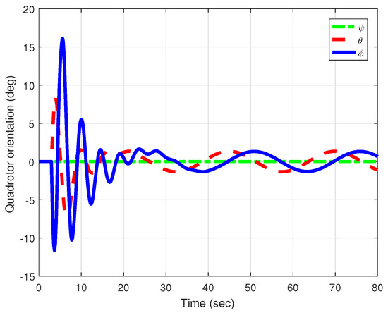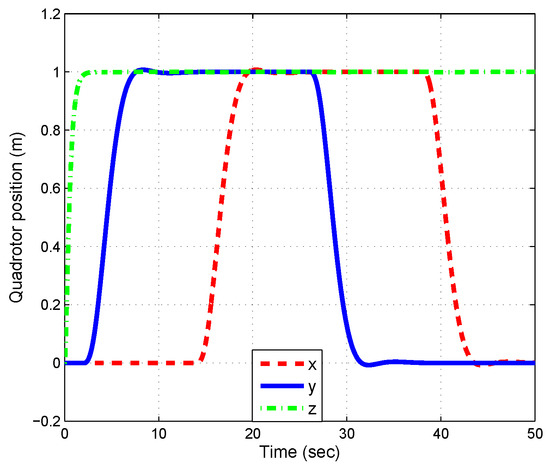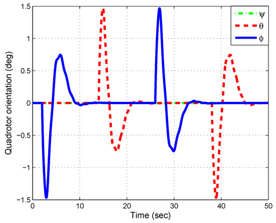 The simulation results of the feedback controller based on LMI (inner-loop of the system) show the quadrotor’s orientation dynamics in Figure 7. We can see that the attitude converged to the desired points with a null steady-state error. The evolution of the control inputs f, , , and are presented in Figure 8. Finally, a three-dimensional view of the path followed by the vehicle is depicted in Figure 9.
