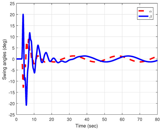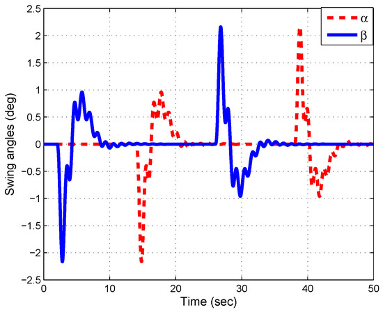 Figure 6 displays the payload swing angles α and β. It is clear that the proposed control law exhibited good performance, since the payload swing angles were regulated to at around 5 s and the maximum overshoot was ±.