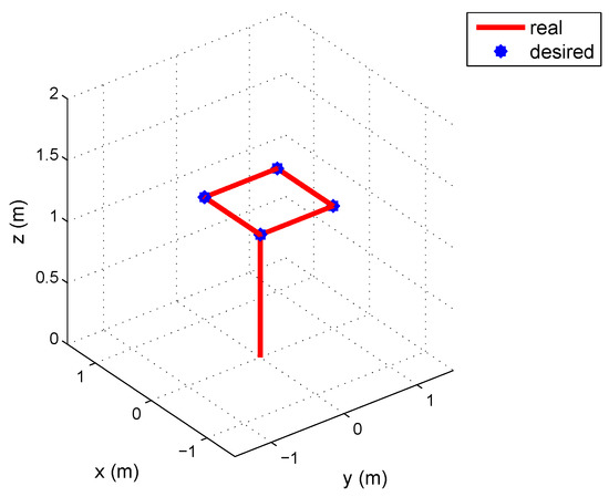 In order to check the performance of the designed control scheme, some simulations were carried out. The objective was to move the vehicle transporting a payload to the desired position of a square of 1 m length at 1 m height. The desired trajectory is then defined by,