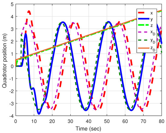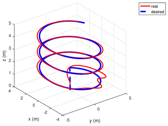 One more numerical experiment was carried out. Figure 10, Figure 11, Figure 12 and Figure 13 illustrate the tracking of an ascending circular trajectory to prove the efficiency of the proposed controller in a scenario that involves simultaneous variations of both α and β angles. These figures show that the proposed control strategy was capable of achieving accurate trajectory tracking since the aircraft converged to the reference trajectory while attenuating the swing angles of the payload.