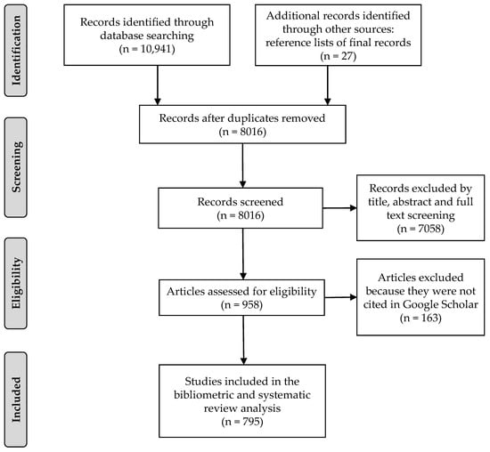 Prior to presenting these results, we describe the process followed to define our final portfolio. After performing the search in both databases, filtering by type of source and excluding all documents but academic journals and books, we obtained a total of 10,941 records (5289 from Web of Science and 5652 from Scopus). Before starting the manual filtering process by the title and then by the abstract, the next step was to remove duplicates. A total of 2952 documents were found in both databases; therefore, we ended up with an initial gross bibliographic portfolio of 7985 records. The 7985 articles were then manually filtered first by title adequacy, and then followed by abstract and full-text alignment with the subject of interest. After conducting these steps, we obtained 931 papers in our final portfolio. However, all articles with no citations in the Google Scholar database were removed because, given the small number of citations, they cannot be considered relevant from an academic viewpoint. Following this approach, the number of articles decreased to 768. For the final bibliographic portfolio, all of the references included in each of the 768 papers were analysed to assess whether they could be included in the final portfolio. This increased the number of eligible papers by 27, resulting in a final portfolio of 795 articles. A flow diagram showing this study selection process at each stage is presented in Figure 1.