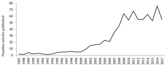 The number of articles published by year (1987–2017) exploring the use of fuzzy logic in finance has increased significantly since the mid-2000s.