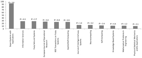 In Figure 3, the academic journals that appear with greater frequency in our portfolio are shown. In addition, we included the 2017 impact factor for each article. When focusing on the most relevant journals, we found that Expert Systems with Applications is the journal with the greatest number of articles within our portfolio, with more than 90 articles and an impact factor of 3.76. Information Sciences and Fuzzy Sets and Systems followed, with 28 and 27 articles, respectively, and impact factors of 4.31 and 2.68. These findings place Expert Systems with Applications as the leading journal associated with financial research conducted using fuzzy logic methods. Overall, in our final portfolio, we found 300 different journals. However, approximately 50% of all articles are concentrated in only 25 journals, with an average impact factor of 2.7.