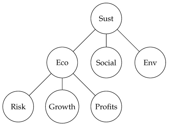 A graph representing a hierarchy of criteria: Sustainability (Sust), Social, Environmental (Env), Economic (Eco), and its three subcriteria: Risk, Growth, and Profits.