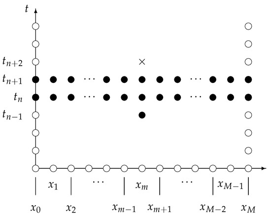 Forward-difference stencil for the approximation to the exact solution of the partial differential equation of Equation (6) at the time , using the finite-difference scheme in Equation (30). The black circles represent the known approximations at the times , and , while the cross denotes the unknown approximation at the time .