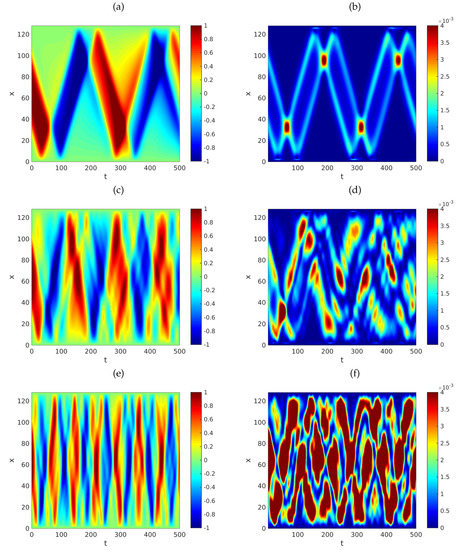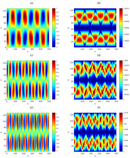 Graphs of the approximate solution (a,c,e) and respective energy densities (b,d,f) of the system in Equation (6) versus t and x. The parameters employed are , , and is given by Equation (75). We used , and . The initial data were defined by the functions , and , for each . Here, v is the function defined by Equation (76). Computationally, we fixed and . We employed with (a,b), (c,d) and (e,f).