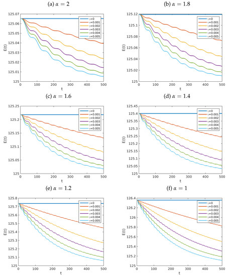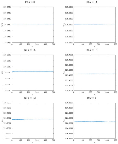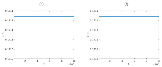 Graphs of the total energy of the system in Equation (6) versus t. The parameters employed are , , and is given by Equation (75). We used , , , and . The initial data were defined by the functions , and , for each . Here, v is the function defined by Equation (76). Computationally, we fixed , and we employed: (a) ; (b) ; (c) ; (d) ; (e) ; and (f) . The range of the scale of the y-axis is the interval .