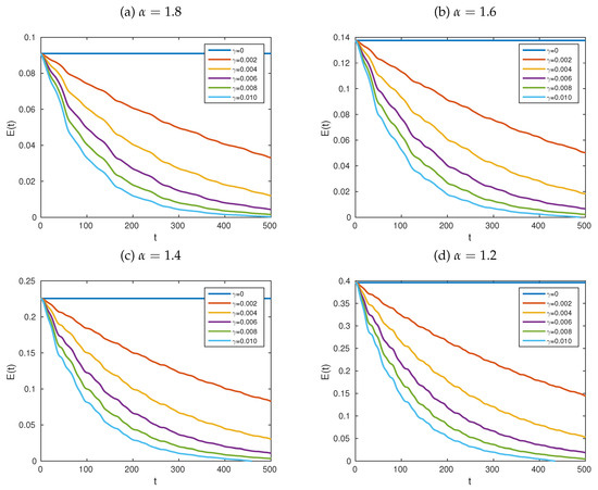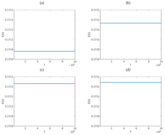 Graphs of the dynamics of the total energy of the system in Equation (6) for with (a) , (b) , (c) and (d) . The parameters employed are , , and is given by Equation (75). We used and . The initial data were defined by the functions , and , for each . Here, v is the function defined by Equation (76). Computationally, we fixed and . In each case, we used the values of shown within the legend at the bottom of each graph.