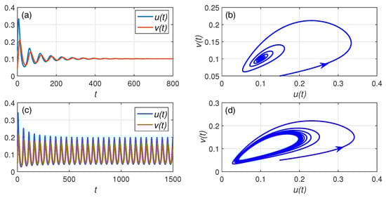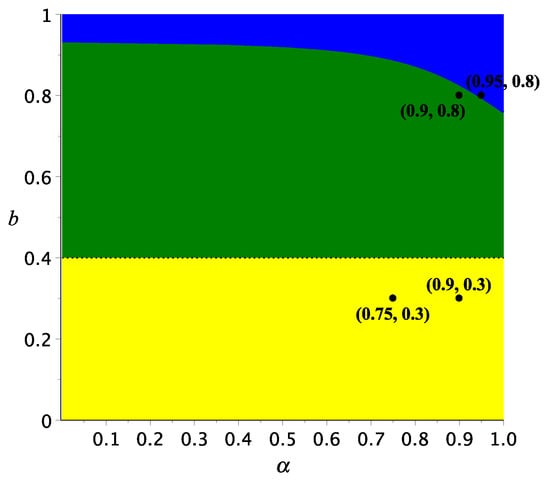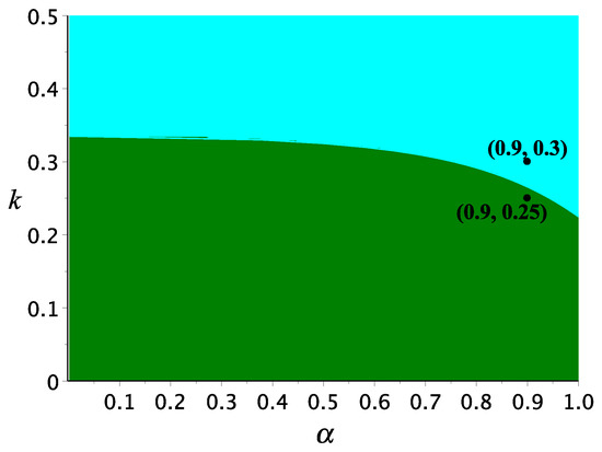- Suppose . If is an eigenvalue, then its complex conjugate is also an eigenvalue. We have that . Using the Matignon’s condition (see Theorem 2), it is obvious that is locally asymptotically stable if .