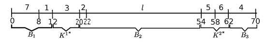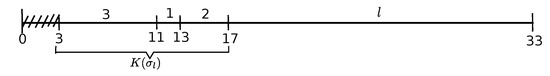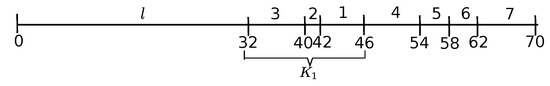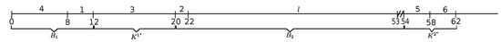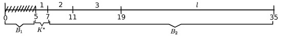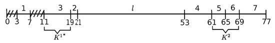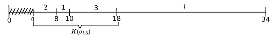 Throughout this section, we concentrate our attention to the part of schedule initiating at the starting time of Job l in schedule S and containing all the newly arisen continuous parts of kernel K in that schedule that we denote by . We treat this part as an independent ED-schedule consisting of solely the jobs of the collapsed kernel K (recall that no job distinct from a job of kernel K may be included in schedule until all jobs of kernel K are scheduled, by the definition of that schedule). For the instance of Example 1 with , schedule is the part of the ED-schedule of Figure 2 that initiates at at Time 0 and ends at Time 17. For the instance of Example 2, schedule starts at Time 0 and ends at Time 20 (see Figure 4).