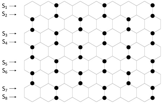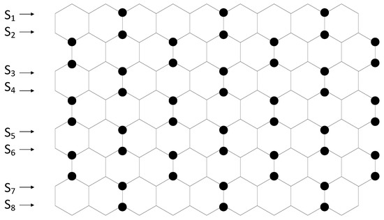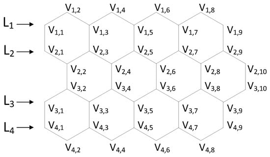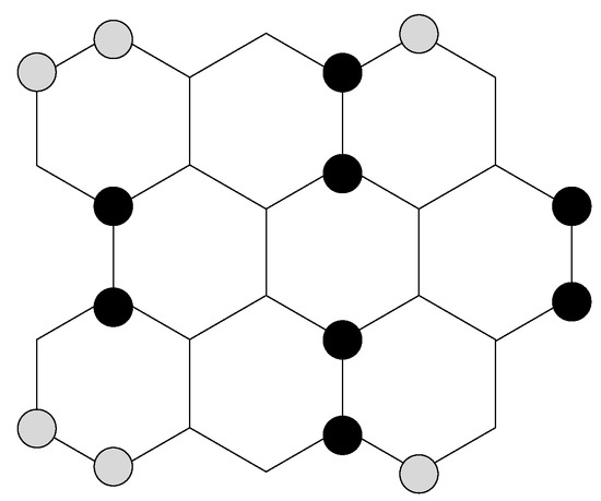 We denote by a hexagonal grid with m hexagons in a row and n hexagons in a column. For , we have a linear hexagonal chain, and for , a double hexagonal chains. In , any zigzag line with no vertical edges is called a horizontal zigzag line. The horizontal zigzag line of is denoted by , , where vertices on are , if . Otherwise, for each , , we have vertices . Therefore, on , there are vertices. See Figure 1 for an example for .