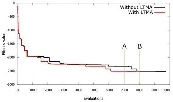 Although duplicate individuals (revisited solutions) have been recognized as unproductive from the beginning of EAs, not enough research has been done to evaluate how costly it is to identify duplicates and how much benefit can be gained if duplicates can be identified and replaced with new solutions. For example, Koza wrote in [15]: “Duplicate individuals in the initial random generation are unproductive deadwood; they waste computational resources and reduce the genetic diversity of the population” undesirably. However, duplicate individuals in Genetic Programming (GP) [15] have been identified only in initial random generation. This is because duplicate random individuals are especially likely to be generated when the trees are small, and discovering duplicates in the later phases when the trees are large would be a costly process, not to mention the cost of keeping track of all solutions (trees in the case of GP) over the entire evolutionary process (over all generations). In Teaching-Learning Based Optimization (TLBO) [7], a duplicate elimination phase has been introduced to replace duplicates generated in one generation with random solutions, but duplicates were not checked with previous solutions found in earlier generations. Even more importantly, in TLBO, fitness evaluations were re-computed on duplicates and only later replaced with random solutions consuming more fitness evaluations [16,17]. The immediate question that arises is: How much can we profit if fitness evaluations are not re-computed on duplicates, and how costly is it to discover duplicates over the whole evolutionary process? However, the question is if this problem is real. Do EAs indeed generate many duplicates? We have often used the Artificial Bee Colony (ABC) algorithm in the past [18,19] and discovered that ABC exploitation performed in employed and onlooker bee phases actually generates many duplicates. Figure 1 shows one such example of using ABC where a convergence graph with duplicates (without Long Term Memory Assistance (LTMA)) is compared with a convergence graph with no duplicates (with LTMA), where duplicates are rather replaced with new solutions. For a fair comparison, a single run was used for both scenarios (red and black lines). LTMA was simulated based on a full run, by removing duplicate solutions that, in the case of using LTMA, would not be generated. As a result, the algorithm with LTMA converged earlier (the flat parts of the line are shorter, where duplicates were generated). Even in this simple example (Figure 1), it is clear that gains can be substantial (e.g., Solution A with Long Term Memory Assistance (LTMA) in Figure 1 can be found at least 1000 evaluations earlier than the same Solution B without LTMA). Especially in real-world problems where fitness evaluations are costly, we can expect large gains on CPU time by not re-computing fitness evaluations of duplicates or even better solutions when duplicates are rather replaced with new solutions enhancing the exploration and exploitation of the search space. However, how much we can gain from discovering duplicates and replacing them with new solutions has not been tested before. Hence, we decided to explore this topic more deeply on problems where solutions are represented as a vector of real numbers. Using graphs and trees (e.g., as in GP) as representations of solutions is out of the scope of this study.