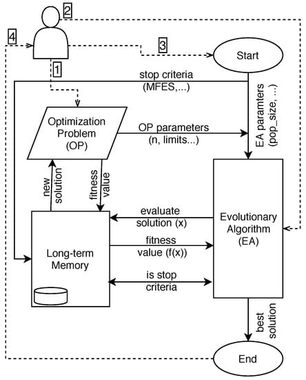 In the implementation of LTMA, users first interact with the OP module to select an optimization problem and problem specific parameters such as constraints, dimension, upper and lower bounds, among others (Figure 2, Step 1). Then, users determine the EA and its parameters (e.g., , mutation and crossover probabilities () in the case of genetic algorithms), which are forwarded to the EA module (Figure 2, Step 2). Finally, execution parameters such as stopping criterion will be requested and passed to the LTMA module. Once all the configurations are done, EA will start to run the optimization process (Figure 2, Step 3). During a run of the optimization, the EA module explores or exploits a solution (x), which is then passed to the LTMA module to check whether the solution has been re-visited or not. Only if the solution has not been visited before will it be passed to the OP module to compute its fitness value (). Namely, the LTMA module records all duplicate individuals and prevents redundant time-consuming re-evaluations. Finally, the fitness value will be passed back to the EA module (Figure 2, Step 4). The experiment will continue until the stopping criterion is met. Note that the LTMA module is in charge of the termination of a run. This is because LTMA possesses visited solutions, which could be used as useful information to determine whether to continue to consume unused fitness evaluations before the stopping criterion is met. Since the LTMA module is integrated in EARS, a generalized and extendable EA framework, the proposed work featuring long term memory can be applied to a variety of optimization problems and algorithms in a uniform way.