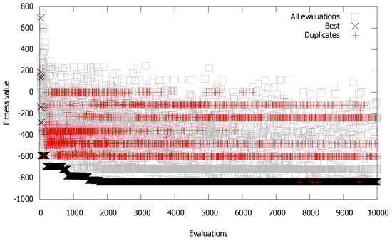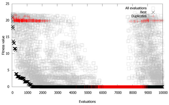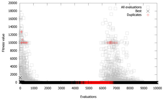 A better insight into the duplicates’ generation of a specific EA was obtained by observing the convergence graph of a particular independent run. Visualization of the convergence graph (black crosses) was enhanced with visualization of all generated solutions (gray squares) and duplicate solutions (red pluses). In particular, we would like to know how good the generated solutions (gray squares) were in terms of fitness, in which phases duplicates (red pluses) appeared (e.g., early in the search, when approaching local or global optima), and what was the convergence graph of the best solutions so far (black crosses). Such visualization helped us to understand better how specific EAs performed exploitation and exploration of the search space [14]. Namely, if the newly generated solutions (gray squares) were close to local optima or even to the best current solution (black crosses), then the EA was in the process of exploitation. On the other hand, if newly generated solutions (gray squares) were far from the best current solutions (black crosses), then the EA must be in the phase of exploration. On the graph, the x axis (horizontal) represents execution time represented by the number of evaluations and the y axis (vertical) the success of the algorithm represented by the fitness value. The graph has three types of data. The first type is all evaluations (gray squares), which represent all fitness evaluations and their values (10,000 of them). The second type of data represents the best solution found so far (best, black crosses) and describes the convergence of the algorithm. The last type of data represents the generated duplicate individuals (duplicates, red pluses). We need to note here that all solutions in the graph are presented by their fitness value (phenotype) and not by the actual result vector x (genotype).