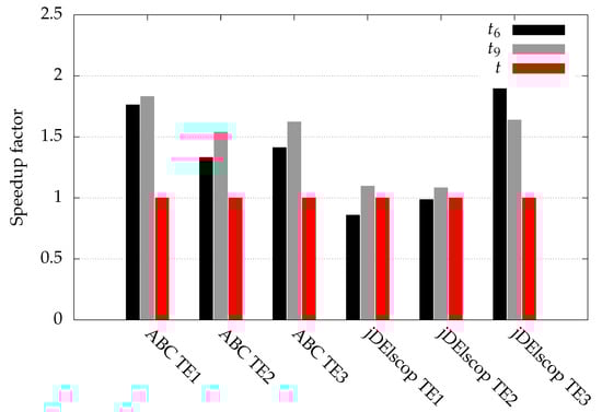 By using the proposed approach, Long Term Memory Assistance (LTMA), there is no need for re-evaluation of a duplicate individual. As such, the gain is the time not needed for a fitness evaluation. On the other hand, we also need to know the time to identify a duplicate. The time needed for a fitness evaluation is obviously problem dependent. In the case of synthetic benchmarks, this is usually very low (one evaluation takes a few ms), but in the case of real-world problems, it can require much more resources (from seconds to hours for one evaluation). Special cases are evaluations with a partial computer simulated model, where an experiment in the physical world is executed for every solution evaluation. The price of such an evaluation is usually very high, and often, surrogate models are used [50,51,52,53]. Therefore, in this study, we are using both problems, i.e., synthetic benchmarks, as well as real-world problems, to investigate this topic more thoroughly. Since we need to take into account the time to identify a duplicate individual, a simple measure would be , as the ratio between CPU time needed when duplicates are not identified, and duplicate individuals are re-evaluated, denoted as , against CPU time with LTMA (denoted as ). By measuring the time of a whole run of a specific EA, the time needed by algorithm specific operations is also taken into account. Therefore, despite dealing with the same problem and the same number of fitness evaluations, EAs will run for different amounts of time. A speedup of would mean that using LTMA would be more time efficient.