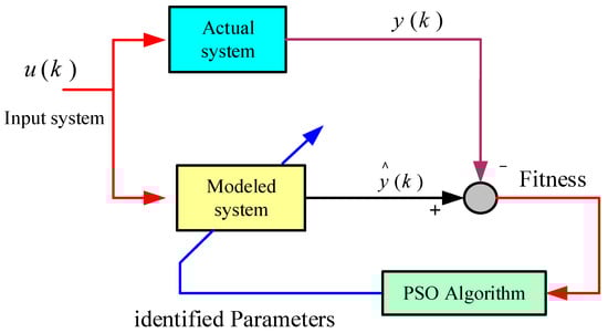 The configuration of the parameter identification methodology in this study is demonstrated in Figure 2. The steps of the optimization process are explained in Figure 3. First, the system input u is known to the actual and modeled systems. After that, the outputs of them are compared and fed to a fitness function. Finally, the calculated value of this function is used as an input to the PSO identifier for the identification process.