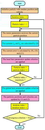 In order to apply the proposed optimization method to the IM model, a proper cost function is essential to be well-defined. From Equation (9), the currents and are the measurable values, and and are the estimated ones. , , and are the system’s unknown parameters. To implement the PSO identification process for the squirrel cage IM, a particular Simulink model in MATLAB software program has been established.