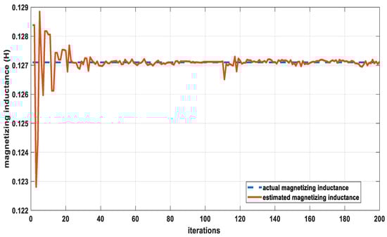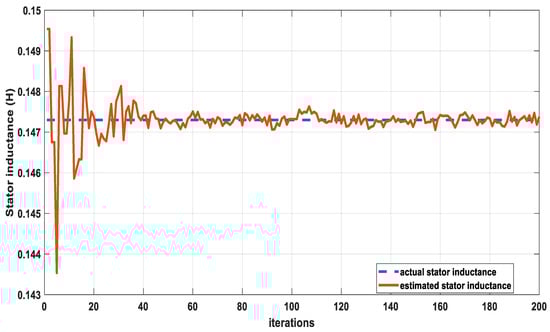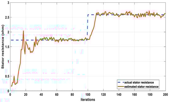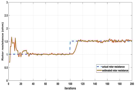 To display the performance of the proposed PSO algorithm, the complete model presented before is simulated using the Matlab environment. The simulation is performed at low speed of 100 rpm and loading of 10 N.m. The estimated motor parameters are plotted versus iterations number as shown in Figure 5, Figure 6, Figure 7 and Figure 8. The PSO algorithm runs with five particles in the swarm and 200 iterations. The stator resistance versus iterations number is plotted in Figure 5 and shows that the parameter tries to be identified at iteration 38. Further, when the stator resistance is increased by 50% from the nominal value (due to increasing the temperature of stator windings), the estimated value corresponds with the actual value only after 10 iterations. Similarly, the rotor resistance is reported in Figure 6, which shows that the algorithm has a reduced sensitivity and begins to precisely track the actual value within 20 iterations. The prediction of magnetizing and stator inductances (Lm and ) are confirmed in Figure 7 and Figure 8. It is clear that the PSO system converges faster with less fluctuation and greatly outperformed the others.