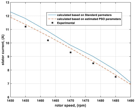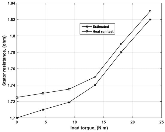 The stator circuit resistance was estimated via PSO at different loading conditions and then compared with the measured values acquired from the heat run test. Figure 13 demonstrates that the values of stator circuit resistance, which have been obtained experimentally from the direct loading test, are in agreement with the estimated ones. The discrepancy between estimated and experimental values is attributed to the mechanical loss and magnetization saturation which have been neglected.