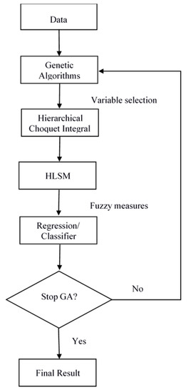 In this paper, we considered our research structure, as shown in Figure 1. First, we considered a real dataset and represented a problem with a hierarchical Choquet integral model. Then, we used Gas to determine the linkage between the input criteria and neurons. Next, we used the HLSM to train the fuzzy measures and calculated the results of the sub-Choquet integral. Furthermore, these results were used to form another regression or classifier to complete a hierarchical Choquet integral for a chromosome. Finally, the processes continued until the stop criterion of GA was met to obtain the final result of the hierarchical Choquet integral.